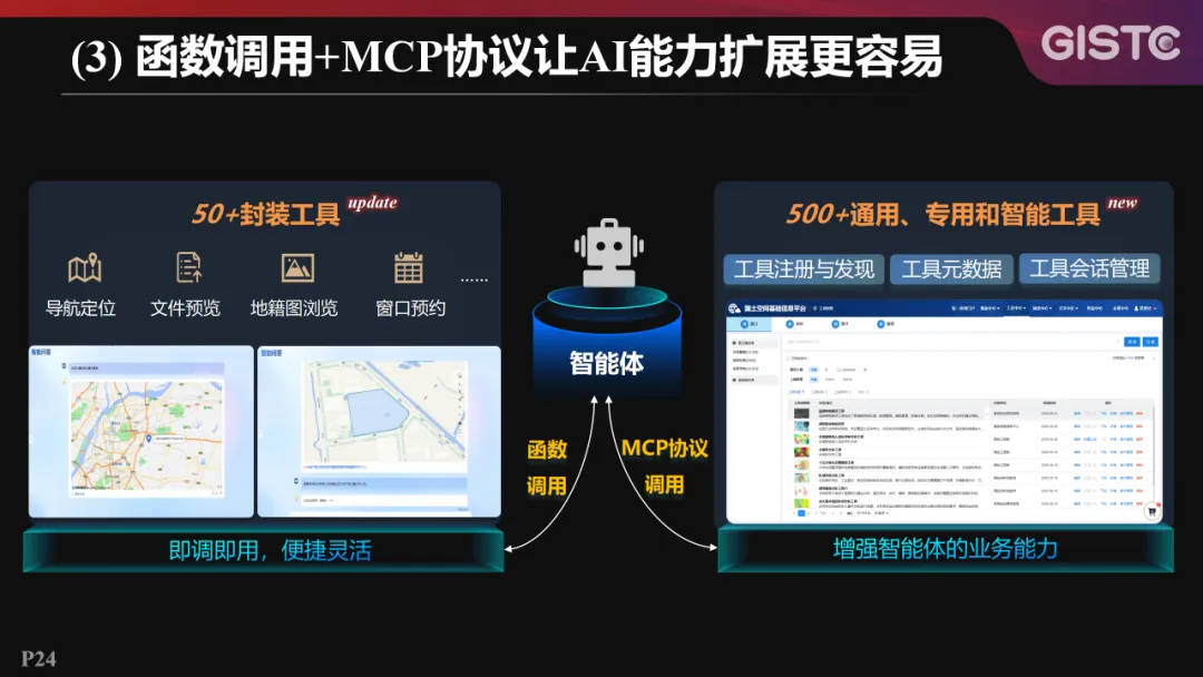 一方面,通过函数调用,智能体可以直接调用应用系统中封装的工具,比如在不动产登记智能体中调用导航定位、文件预览等工具,实现“即调即用”的便捷灵活范式;另一方面,MCP协议进一步打通了国土空间基础信息平台工具中心,支持智能体统一调用其内置的 500 余项通用、专用及智能化工具,从而全面增强业务处理深度与广度。