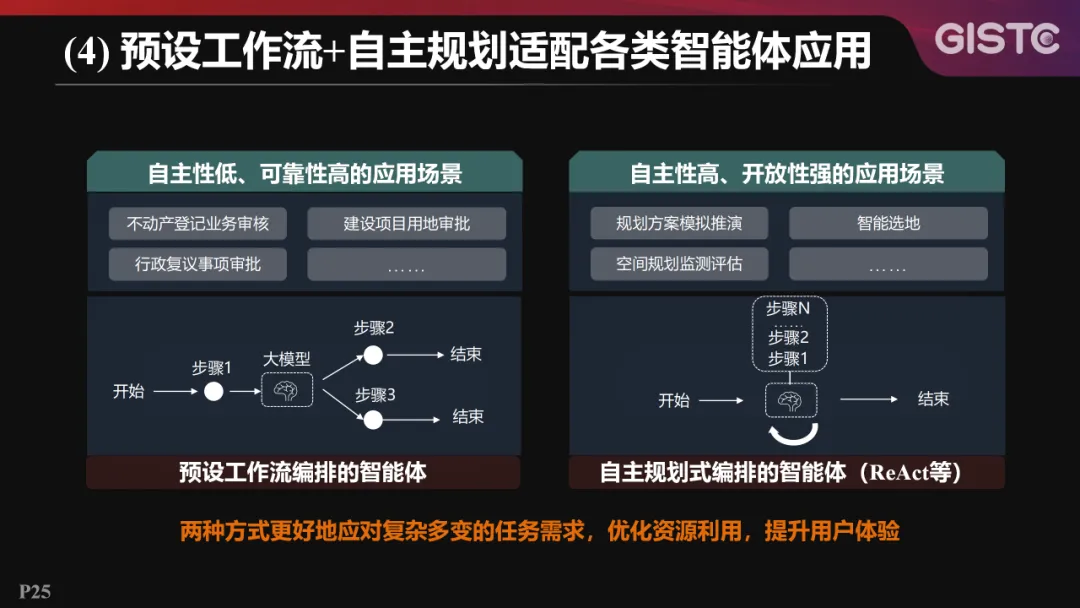 针对不动产登记业务审核、建设项目用地审批等自主性低、可靠性高的应用场景,采用预设工作流编排的智能体;针对规划方案模拟推演、智能选地等自主性高、开放性强的应用场景,采用自主规划式编排的智能体。两种方式能更好地应对复杂多变的任务需求,优化资源利用,提升用户体验。