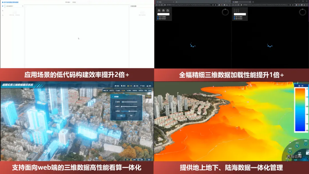 相较上一版本,平台应用场景的低代码构建效率提升逾两倍,全域精细三维数据的加载性能提高一倍以上,支持面向 Web 端的高性能看算一体化能力,并实现地上地下、陆海全域数据的一体化管理。