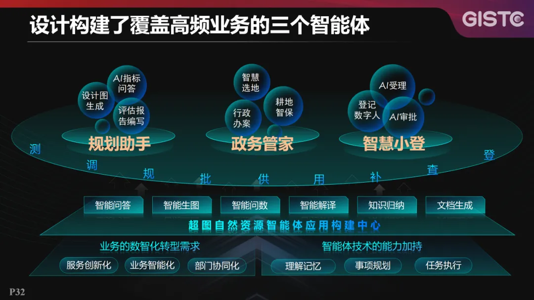 基于自然资源智能体应用构建中心,设计构建了覆盖高频业务的三个智能体:规划助手、政务管家、智慧小登。