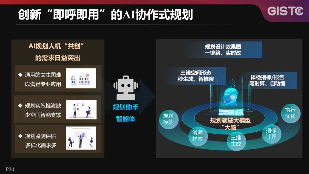 以创新“即呼即用”的AI协作式规划为导向,面向AI规划人机“共创”需求,打造了规划助手智能体。基于规划领域大模型“大脑”,可以实现规划设计效果图的“一键绘、实时改”,三维空间形态“秒生成、智推演”,以及体检指标/报告“随时算、自动编”。