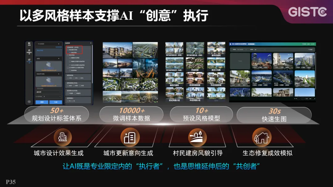 在生图方面,以多风格样本支撑AI创意执行。基于50多项规划设计标签,10000多项微调样本数据和10多个预测风格模型,实现30秒快速生图,能够有效服务于城市设计效果生成、城市更新意向生成、村民建房风貌引导和生态修复成效模拟等方面的应用。