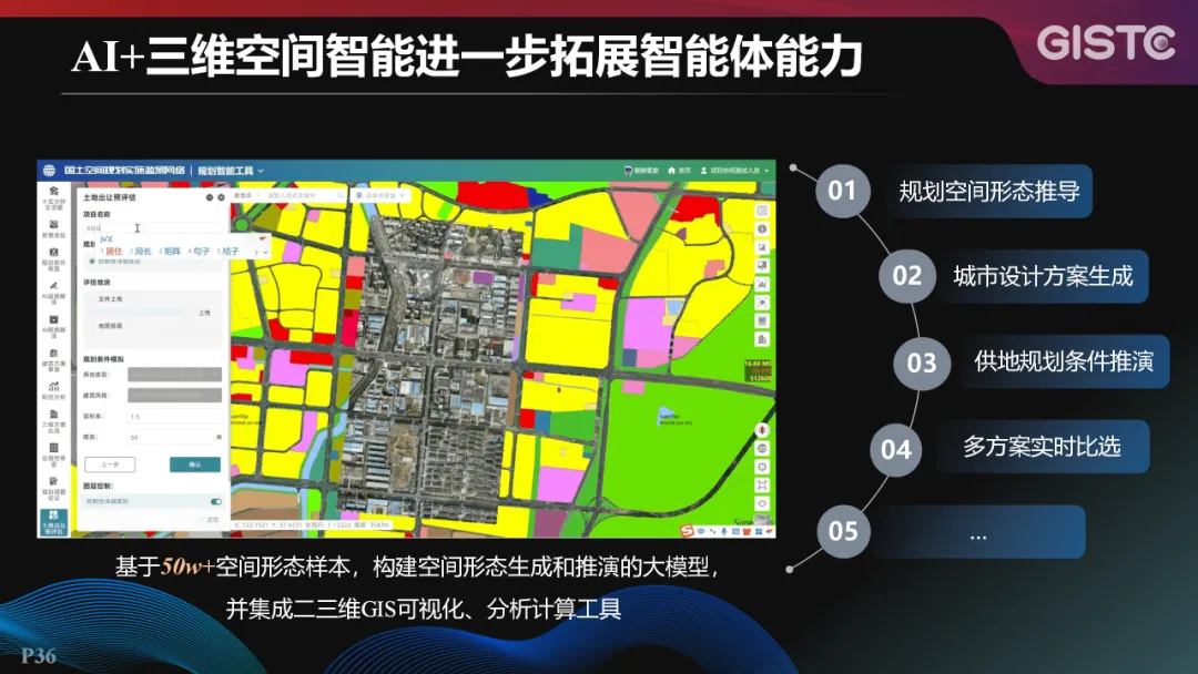 通过AI+三维空间智能,进一步拓展了智能体能力。基于50w+空间形态样本,构建了空间形态生成和推演的大模型,并集成二三维GIS可视化和分析计算工具,满足规划空间形态推导、城市设计方案生成、供地规划条件推演等多项业务需求。
