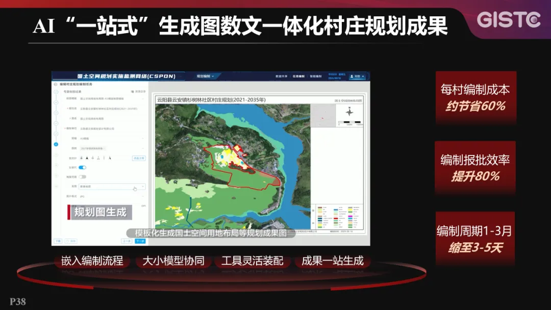 以下是以AI“一站式”生成图数文一体化的村庄规划成果的应用案例。通过嵌入编制流程、大小模型协同以及工具灵活装配,实现成果的一站式生成。每个村庄的规划编制成本可以约节省60%,编制报批效率可以提升80%,大幅缩短了编制的周期。