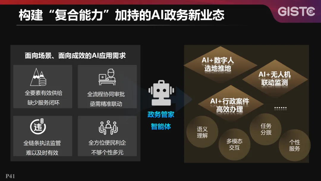 针对面向场景、面向成效的AI应用需求,着力构建“复合能力”加持的AI政务新业态,建设了政务管家智能体,实现AI+数字人选地推地、AI+无人机联动监测、AI+行政案件高效办理等应用。