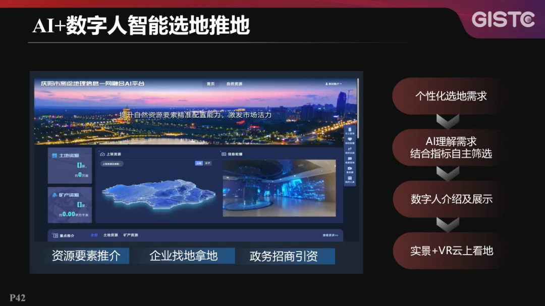 在AI+数字人智能选地推地方面,能根据个性化选地需求,结合指标自主筛选,通过数字人介绍和演示,实践实景+VR云上看地,支撑资源要素推介、企业找地拿地、政府招商引资等多样化应用。