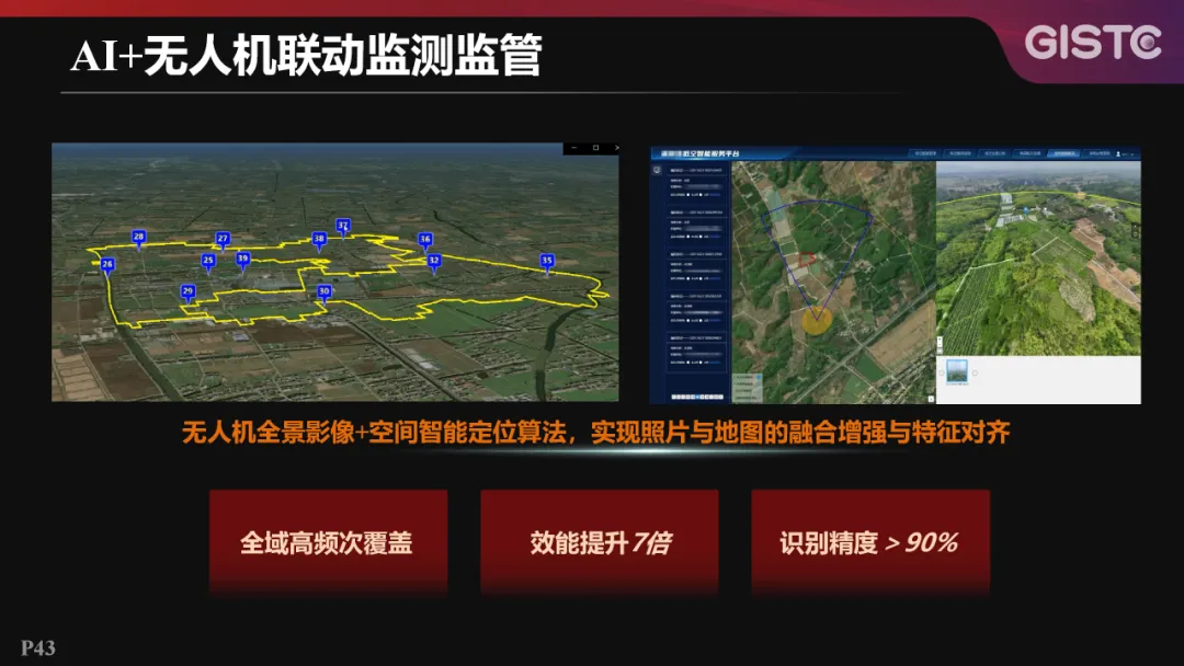 在AI+无人机联动监测监管方面,创新引入无人机全景影像与空间智能定位算法,通过影像与矢量数据的精准叠加,实现照片与地图的融合增强与特征对齐。相较传统正射影像采集模式,该方案可将全域高频覆盖效率提升七倍以上,显著降低监测成本。