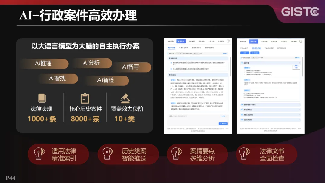 在AI+行政案件高效办理方面,综合了1000多条法律法规,梳理了8000多宗核心历史案件,实现以大语言模型为大脑的自主执行办案,有效支撑适用法律精准索引、历史类案智能推送、案情要点多维分析、法律文书全面检查等场景。