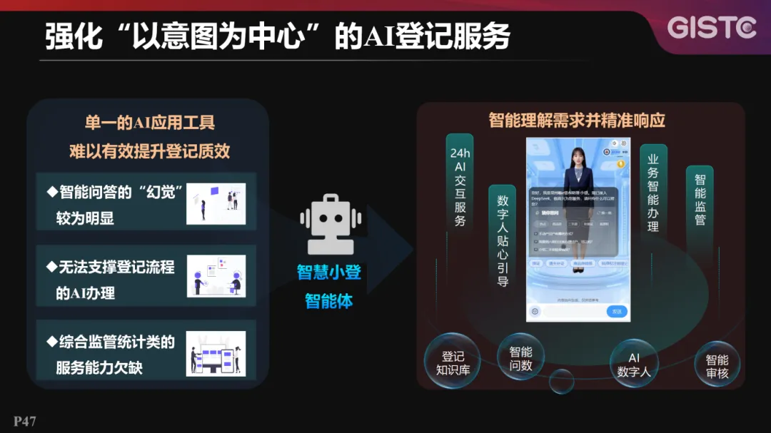 为强化以意图为中心的AI登记服务,智慧小登智能体针对传统工具易现问答幻觉、难以支撑全流程AI办理等局限,集成专业登记知识库、智能问数与数字人技术,实现对用户意图的精准理解与即时响应,提供7×24小时AI交互、数字人引导办理及智能监管等服务。