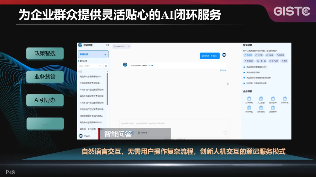 首先,智慧小登为企业群众提供灵活贴心的AI闭环服务。无需用户操作复杂流程,仅需通过自然语言交互,便可实现政策智搜、业务慧答、AI引导办理等功能,创新人机交互的登记服务模式。