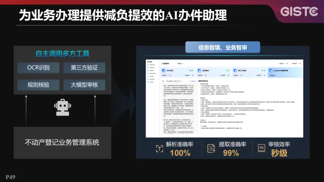 其次,智慧小登为业务办理提供减负提效的AI办件助理。智慧小登智能体能够自主调用不动产登记业务管理系统中的OCR识别、第三方验证、规则核验等工具,实现信息智填、业务智审,大幅提升业务的办理效率和准确度。