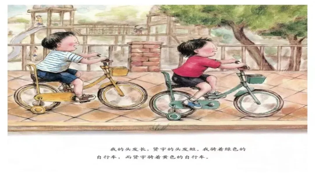 我的头发长,贤宇的头发短。我骑着绿色的自行车,而贤宇骑着黄色的自行车。“小朋友,你知道哪个是我吗?”