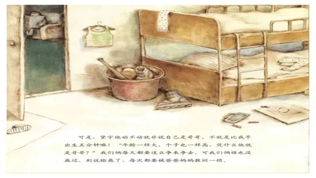 可是,贤宇他动不动就非说自己是哥哥。不就是比我早出生五分钟嘛! “年龄一样大,个子也一样高,凭什么他就是哥哥?”我们俩每天都要这么争来争去,可我们俩谁也没赢过。