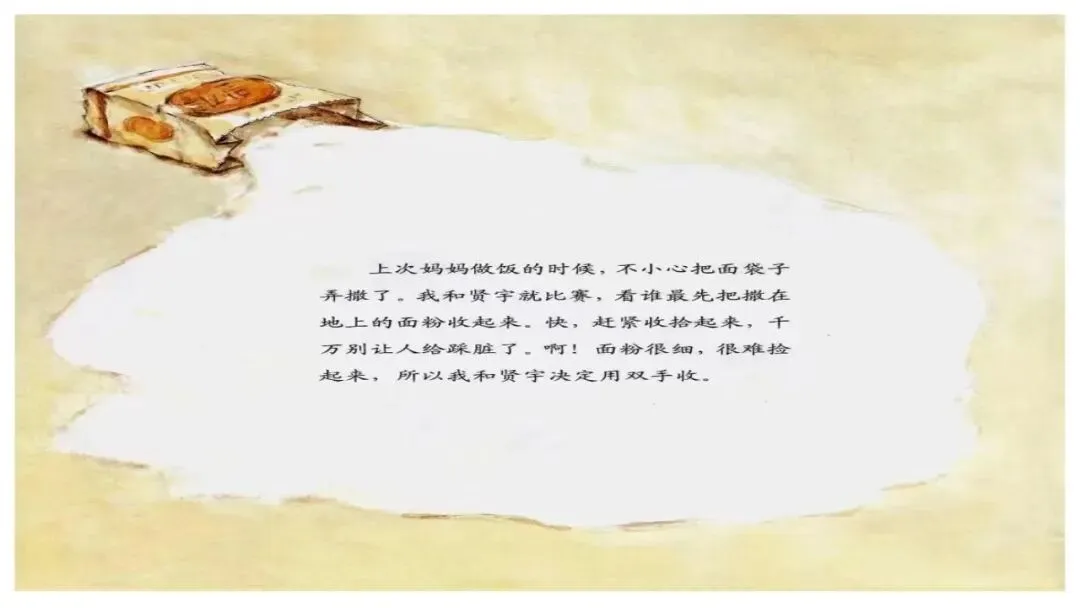 我和贤宇就比赛,看谁最先把撒在地上的面粉收起来。快,赶紧收拾起来,千万别让人给踩脏了。啊!面粉很细,很难捡起来,所以我和贤宇决定用双手收。