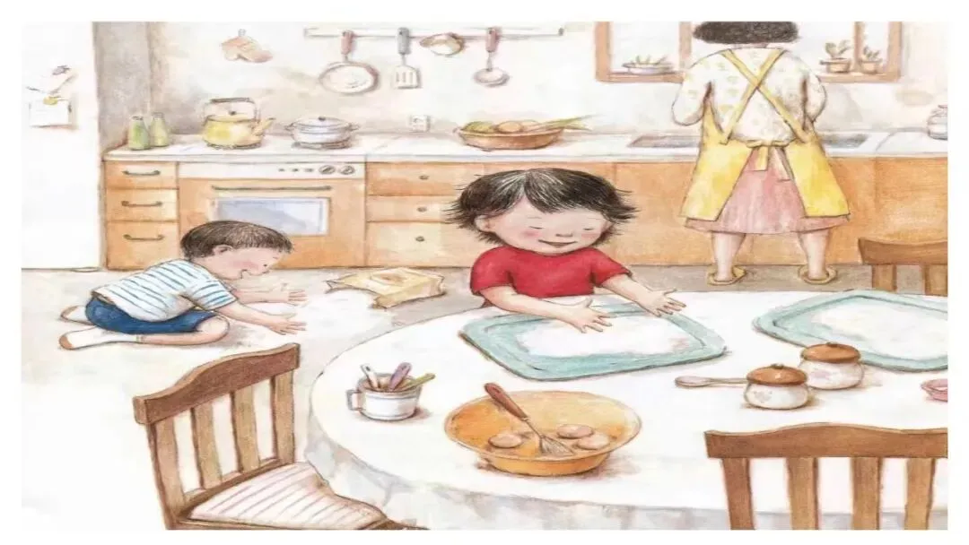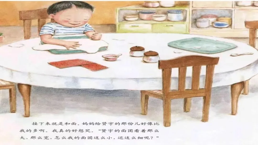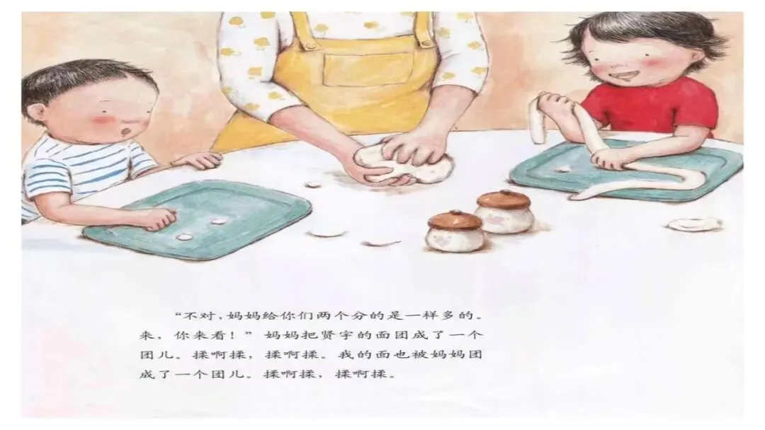 “不对,妈妈给你们两个分的是一样多的。来,你来看!”妈妈把贤宇的面团成了一个团儿。揉啊揉,揉啊揉。我的面也被妈妈团成了一个团儿。揉啊揉,揉啊揉。