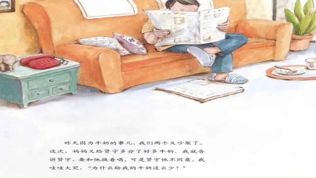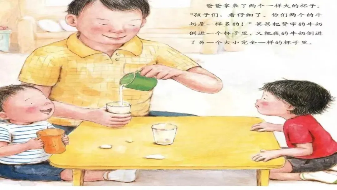 爸爸拿来了两个一样大的杯子。 “孩子们,看仔细了。你们两个的牛奶是一样多的!”爸爸把贤宇的牛奶倒进一个杯子里,又把我的牛奶倒进了另一个大小完全一样的杯子里。