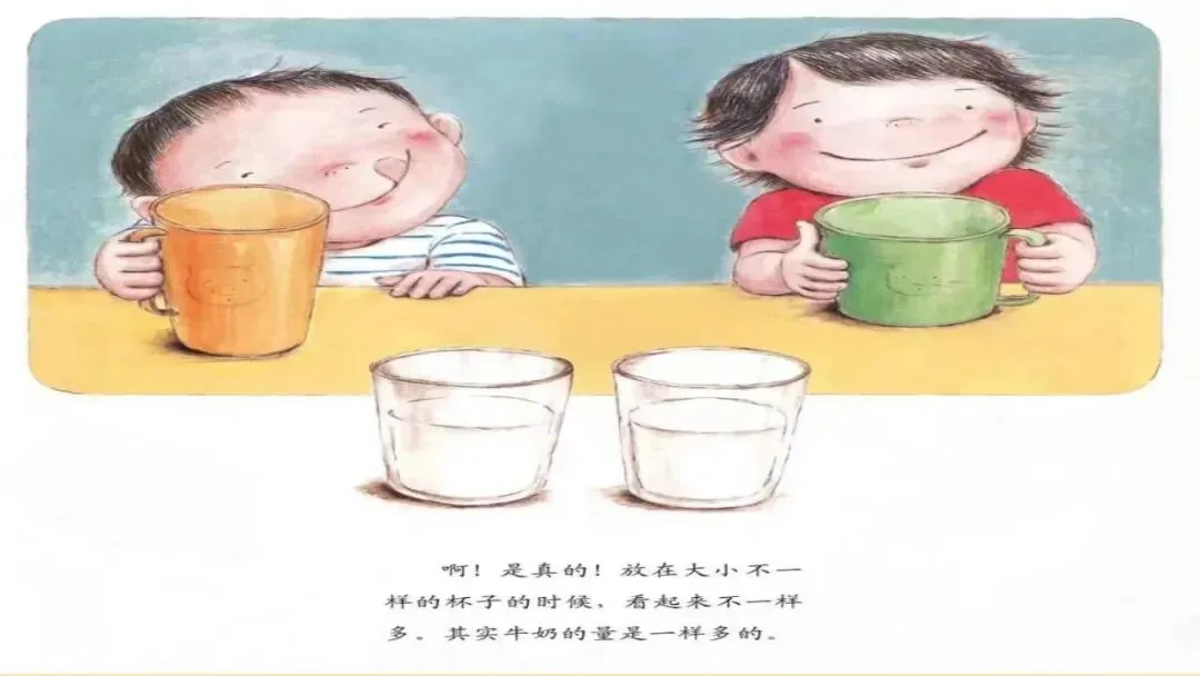 啊!是真的!放在大小不一样的杯子的时候,看起来不一样多。其实牛奶的量是一样多的。