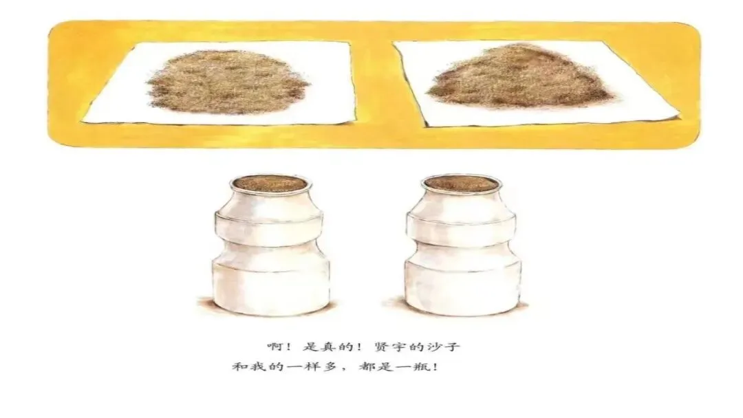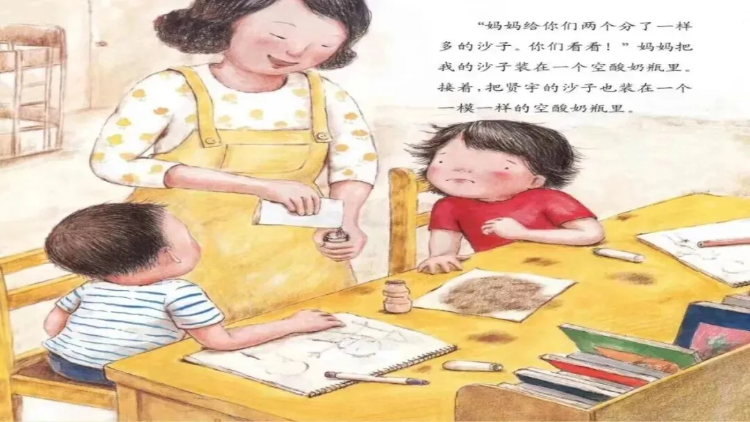 “妈妈给你们两个分了一样多的沙子。你们看看!”妈妈把我的沙子装在一个空酸奶瓶里,接着,把贤宇的沙子也装在一个一模一样的空酸奶瓶里。