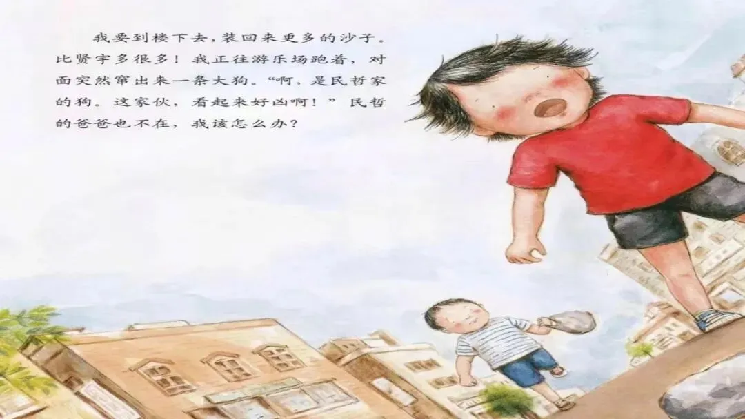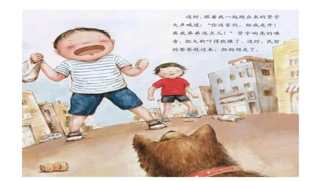 这时,跟着我一起跑出来的贤宇大声喊道:“你这家伙,给我走开!离我弟弟远点儿!”贤宇响亮的嗓音,把大狗吓得犹豫了。这时,民哲的爸爸赶过来,把狗领走了。