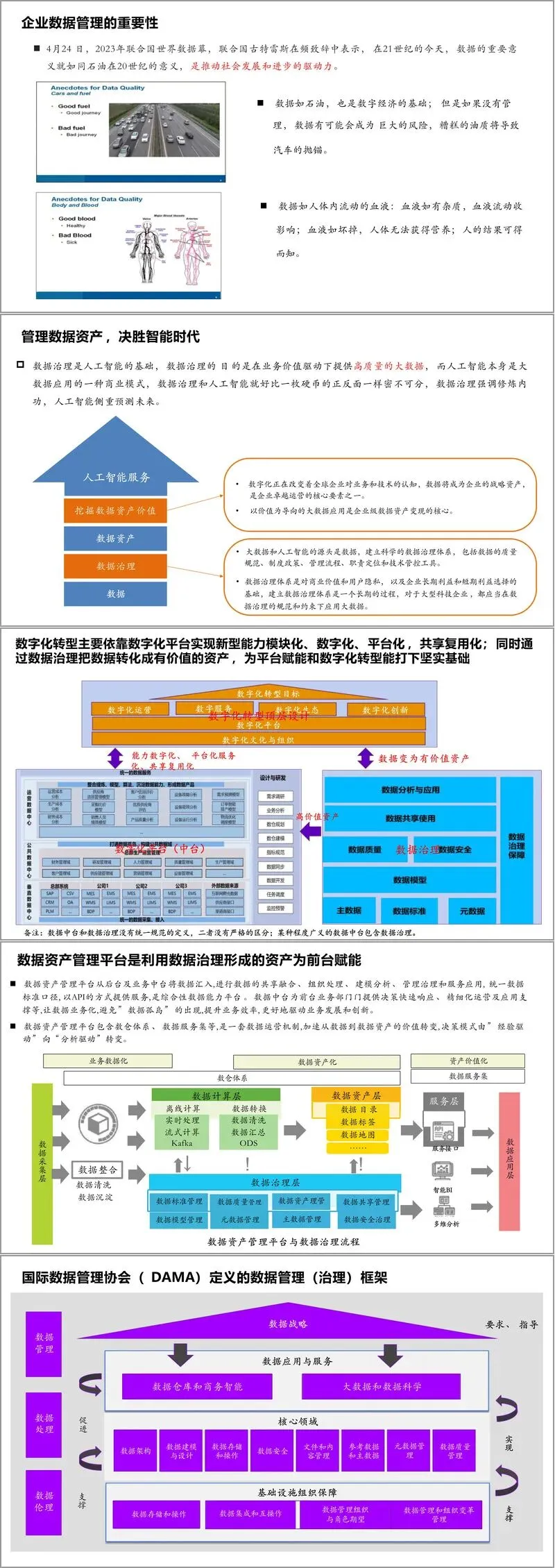 数据治理作为数字化转型的基石,其重要性被反复强调。资料形象地比喻:数据如同石油,是数字经济的基础,但若缺乏有效管理,则会成为巨大风险;数据亦如人体血液,若出现问题,将影响整个机体的运作。数据治理是人工智能应用的基础,二者如同硬币的两面,治理侧重于修炼内功,确保高质量数据供给,而人工智能则侧重于预测未来,挖掘数据资产价值。建立科学的数据治理体系,包括质量规范、制度政策、管理流程、职责定位和技术工具,是企业实现数据资产变现的核心。数据资产管理平台(或称数据中台)承担了将治理后数据转化为资产并为前台业务赋能的重任,它通过统一标准、API服务等方式,避免数据孤岛,驱动业务决策从“经验驱动”转向“分析驱动”。资料介绍了自下而上和自上而下两种治理实施方法论,并引用了DAMA的数据管理框架以及主题数据库的建设思路,强调应围绕核心业务建立稳定、共享的主题数据库。