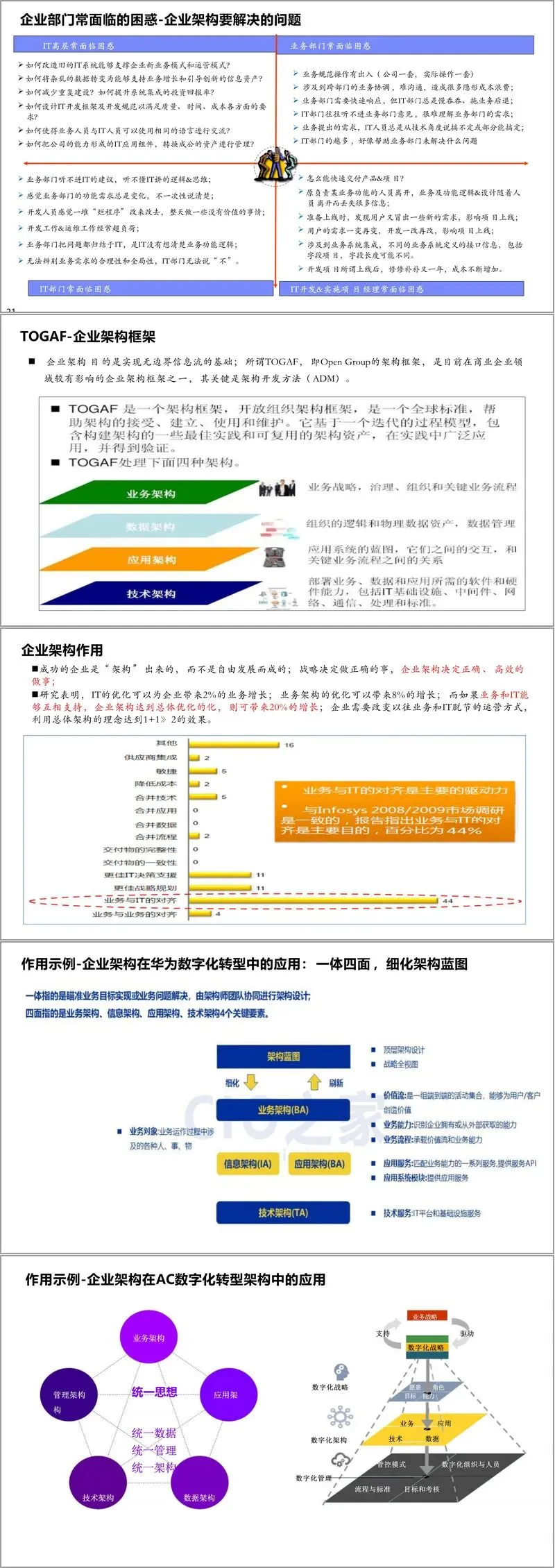 企业架构(EA)则被定位为保障数字化转型成功落地的蓝图和骨架。它旨在解决企业在面对新技术变革、系统集成、数据资产化、成本控制以及核心能力沉淀等方面面临的普遍困惑。TOGAF框架被介绍为业界广泛采用的企业架构开发方法。资料指出,成功的企业是“架构”出来的,而非自由发展而成。研究表明,业务与IT深度融合的企业架构总体优化,可带来高达20%的业务增长,远优于单独优化IT或业务架构的效果。案例中展示了企业架构在华为和埃森哲实践中的应用,通常涵盖业务架构、信息架构、应用架构和技术架构四个层面(一体四面),确保业务战略能够准确、高效地转化为IT能力。企业架构通过明确的蓝图设计,指导应用系统的规划、集成路线图的制定,并在项目招投标阶段就明确架构实施路线,从而保障整体建设的一致性和可持续性。