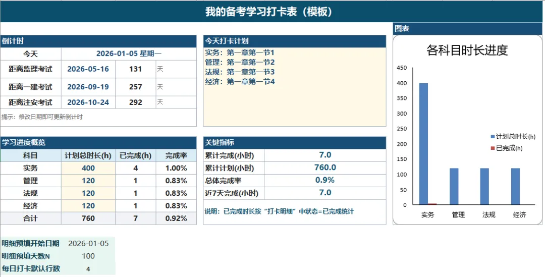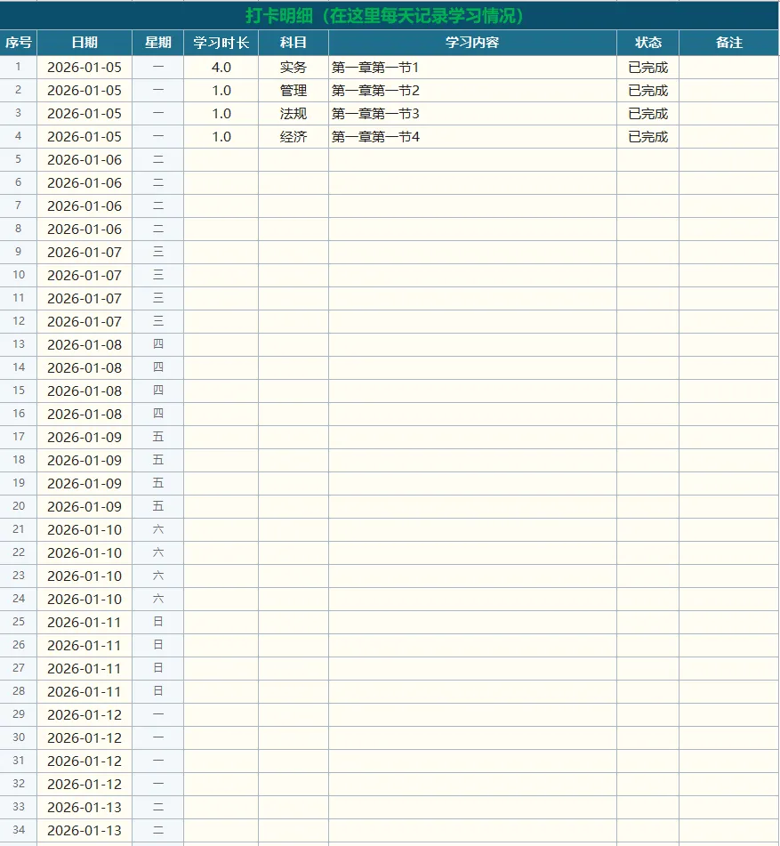 最近看到很多考证人都在用学习打卡表,也做了一个,说实话,我从没进行过打卡学习,可能打卡的仪式感比实际意义更大一些吧。