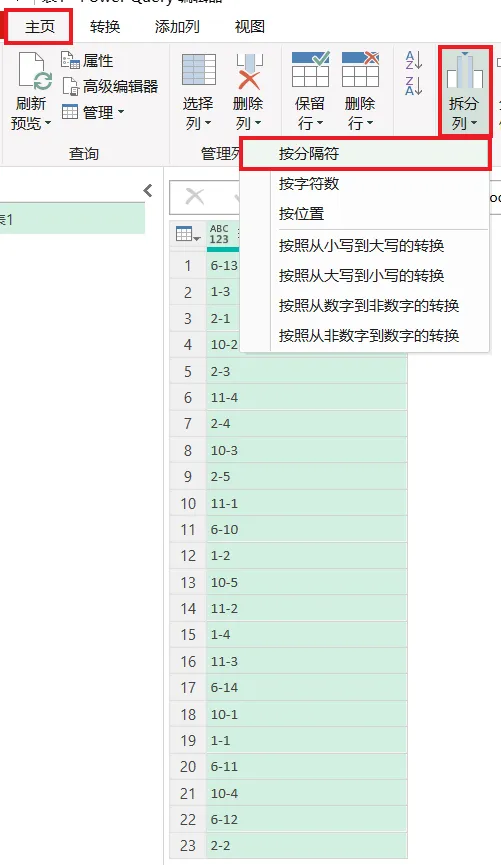 4. 选择任务栏的“主页”-->“拆分列”-->“按分隔符”