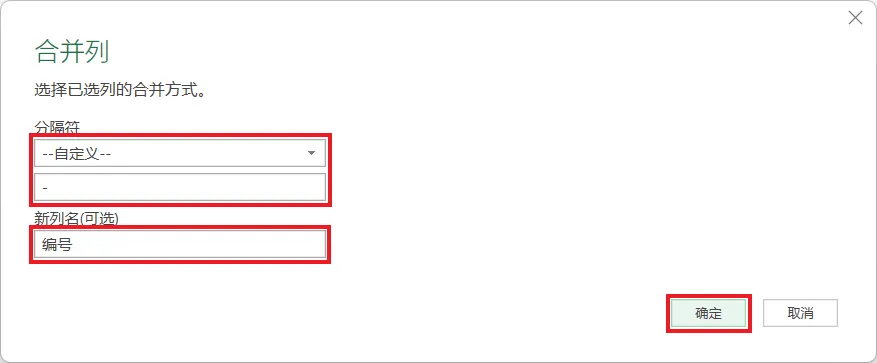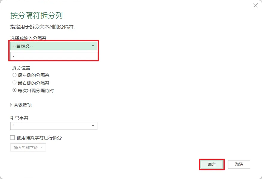 8. 在弹出的对话框中选择“自定义”--> 输入分隔符“-”--> 按需修改列名 --> 点击“确定”
