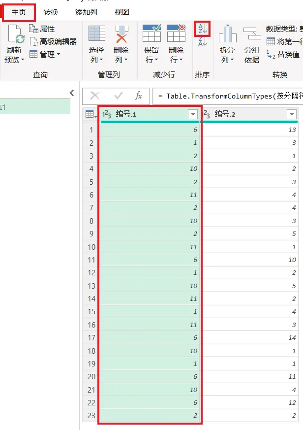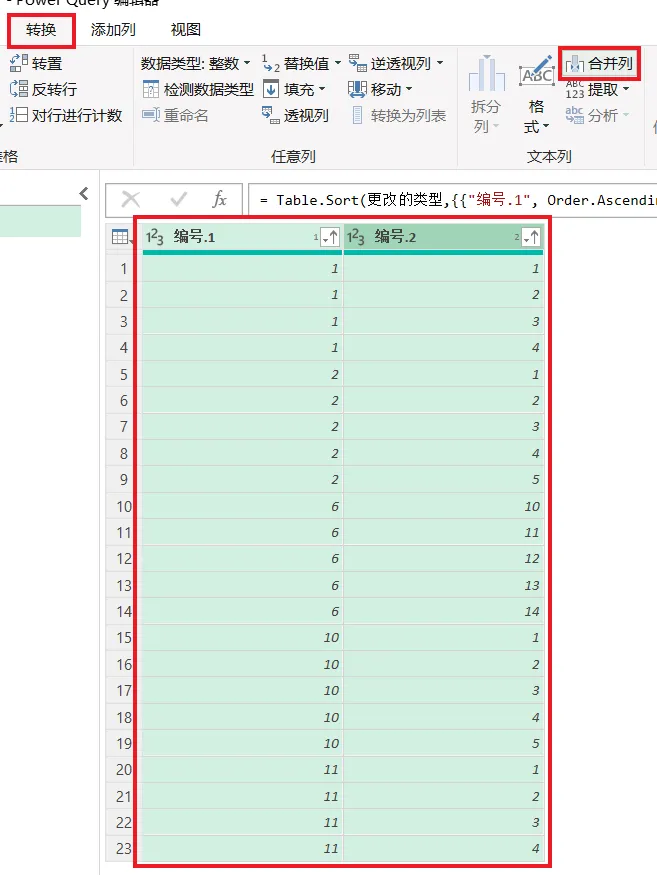 7. 同时选中两列 --> 选择任务栏的“转换”-->“合并列”