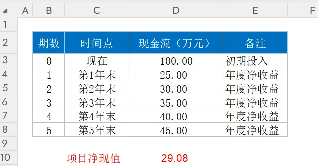 函数语法:=NPV(rate, value1, [value2], ...)=NPV(贴现率, 现金流1, [现金流2], ...)