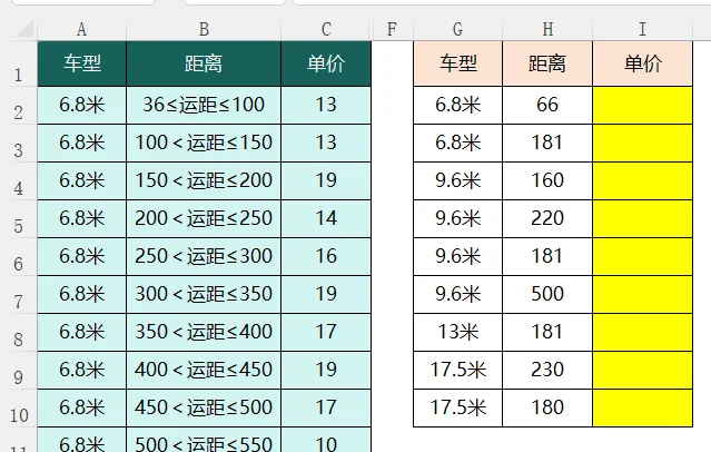 请在I列编写公式,计算符合车型和距离对应的单价是多少。