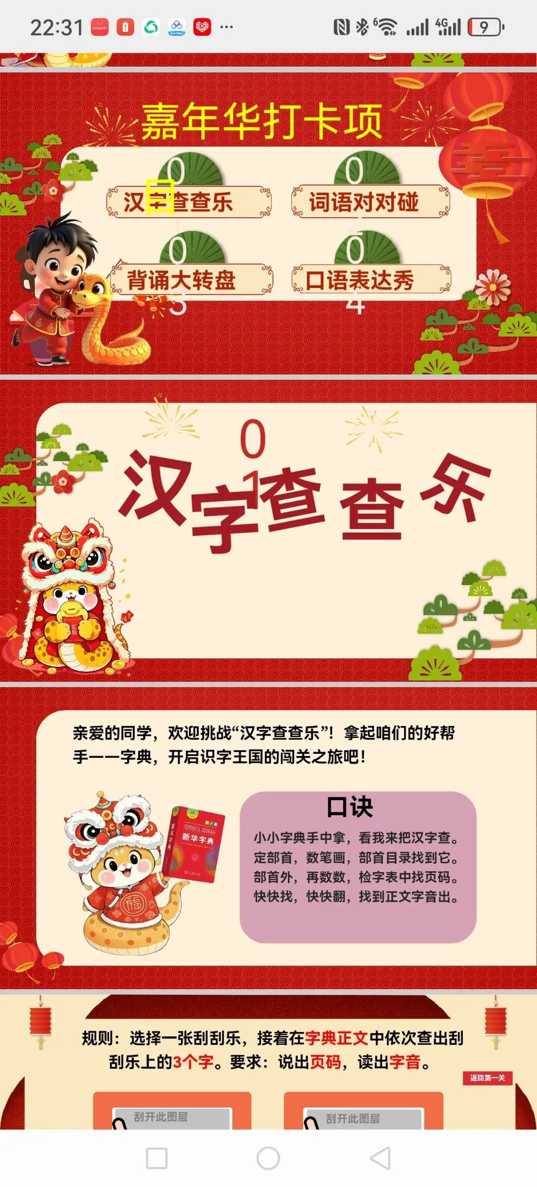 - 第一关:汉字查查乐:学生抽取一张刮刮乐卡片,刮出3个生字后,手持字典开始查字。考官根据学生的查字过程和结果现场评分,并在闯关卡上记录等级。完成后,学生前往下一关候考区。