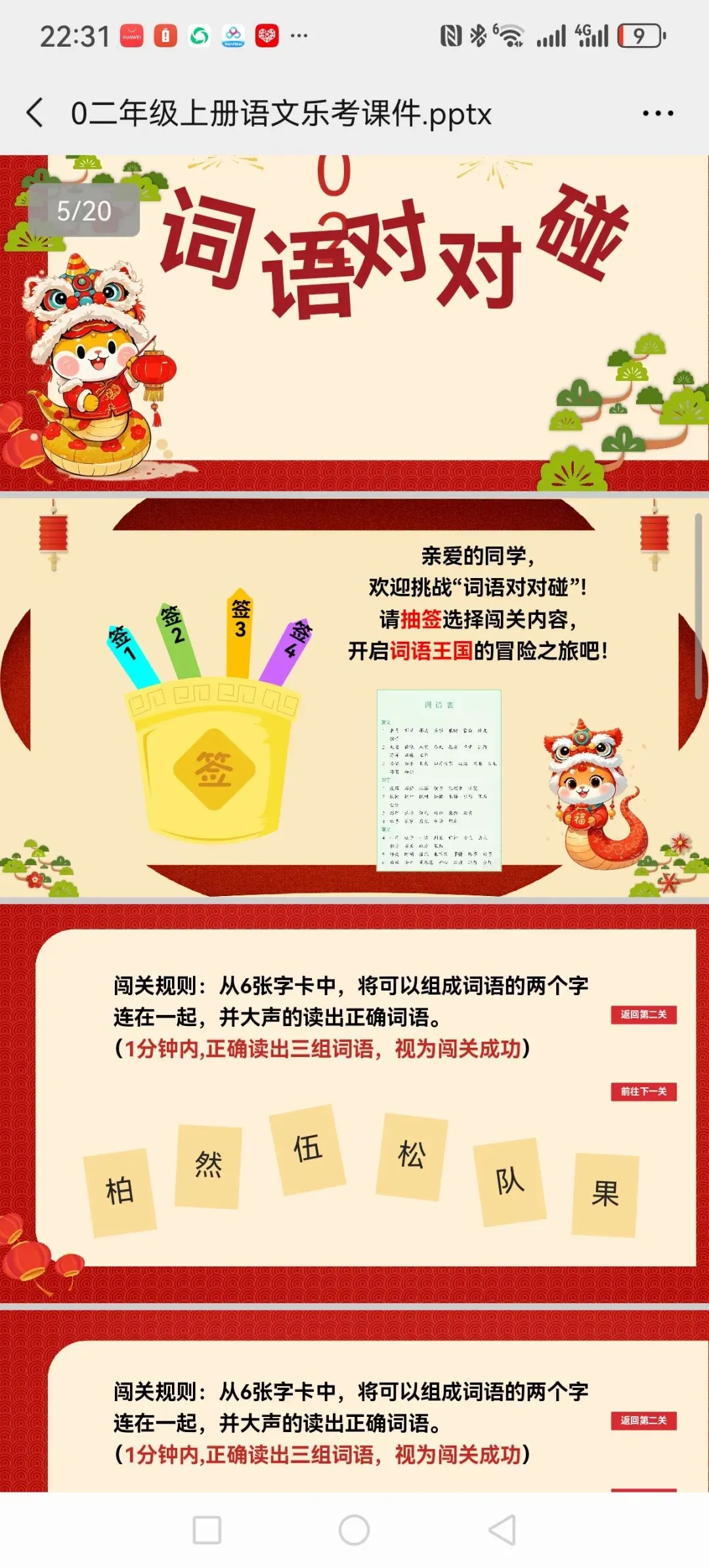 - 第二关:词语对对碰:学生从抽签筒中抽取序号,对应领取一组字卡。考官计时1分钟,学生在规定时间内将能组成词语的汉字配对,并大声读出词语。考官根据完成情况评分并记录。