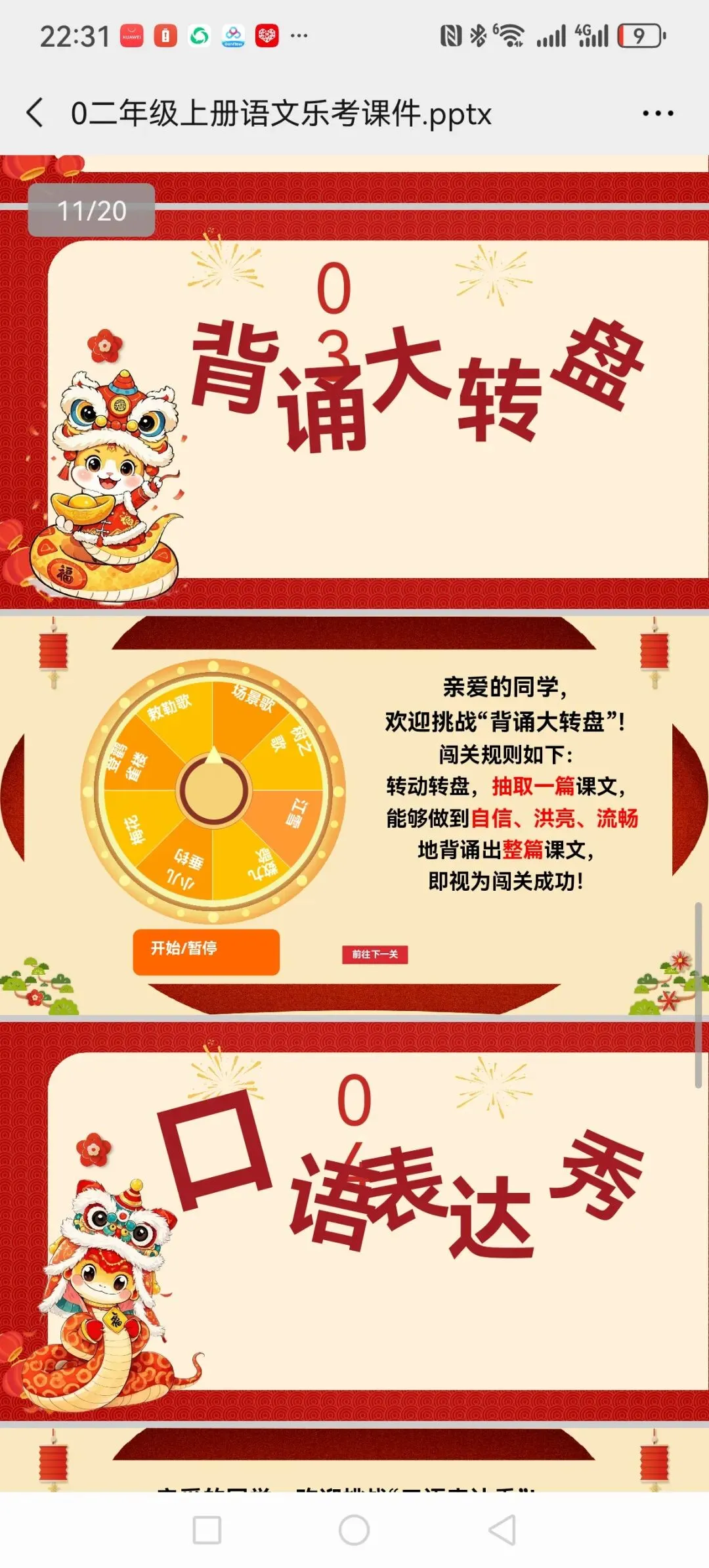 - 第三关:背诵大转盘:学生转动转盘,指针指向的内容即为背诵题目。学生面对考官完整背诵内容,考官根据背诵表现评分并记录。