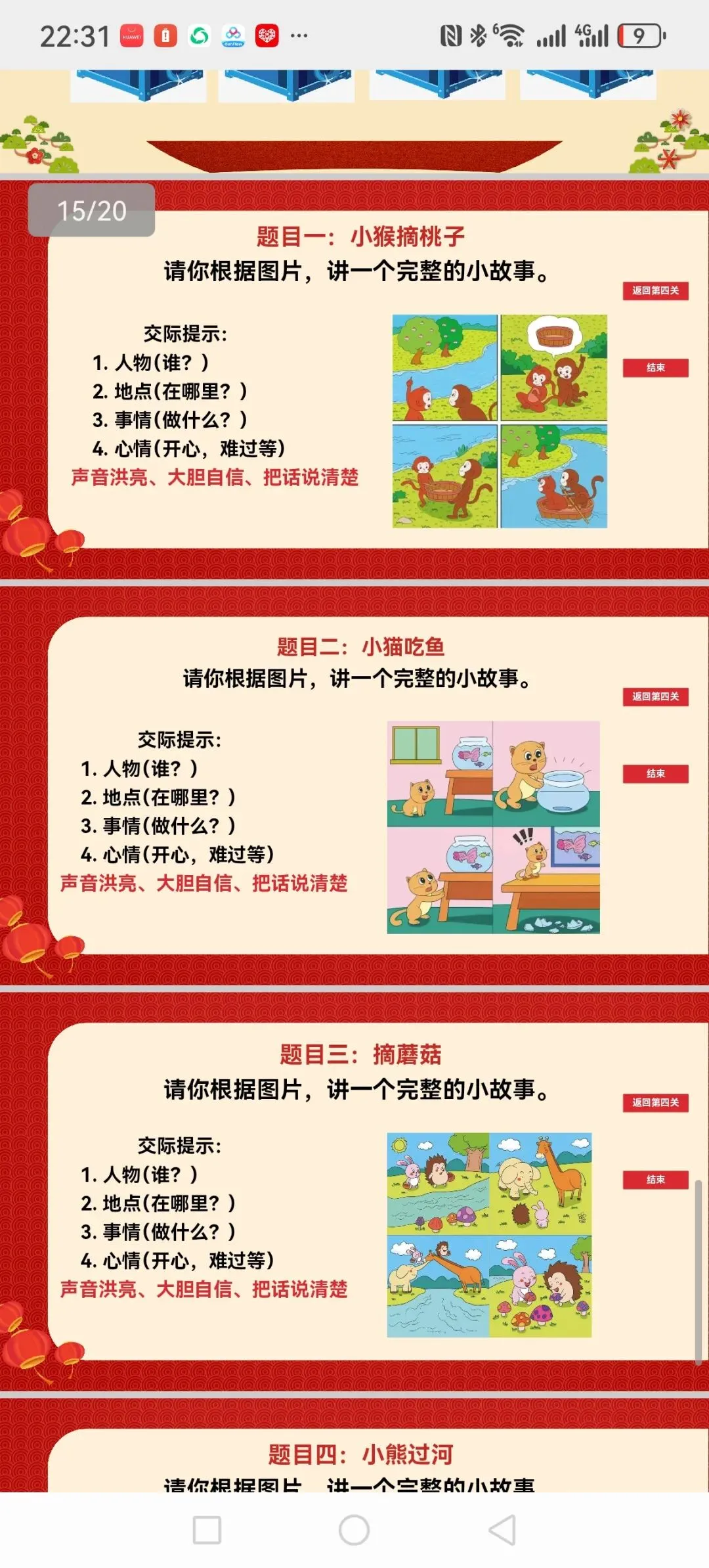 - 第四关:口语表达秀:学生抽取一张看图说话题目卡,有1分钟准备时间后,根据图片讲述小故事。考官根据表达情况评分并记录。