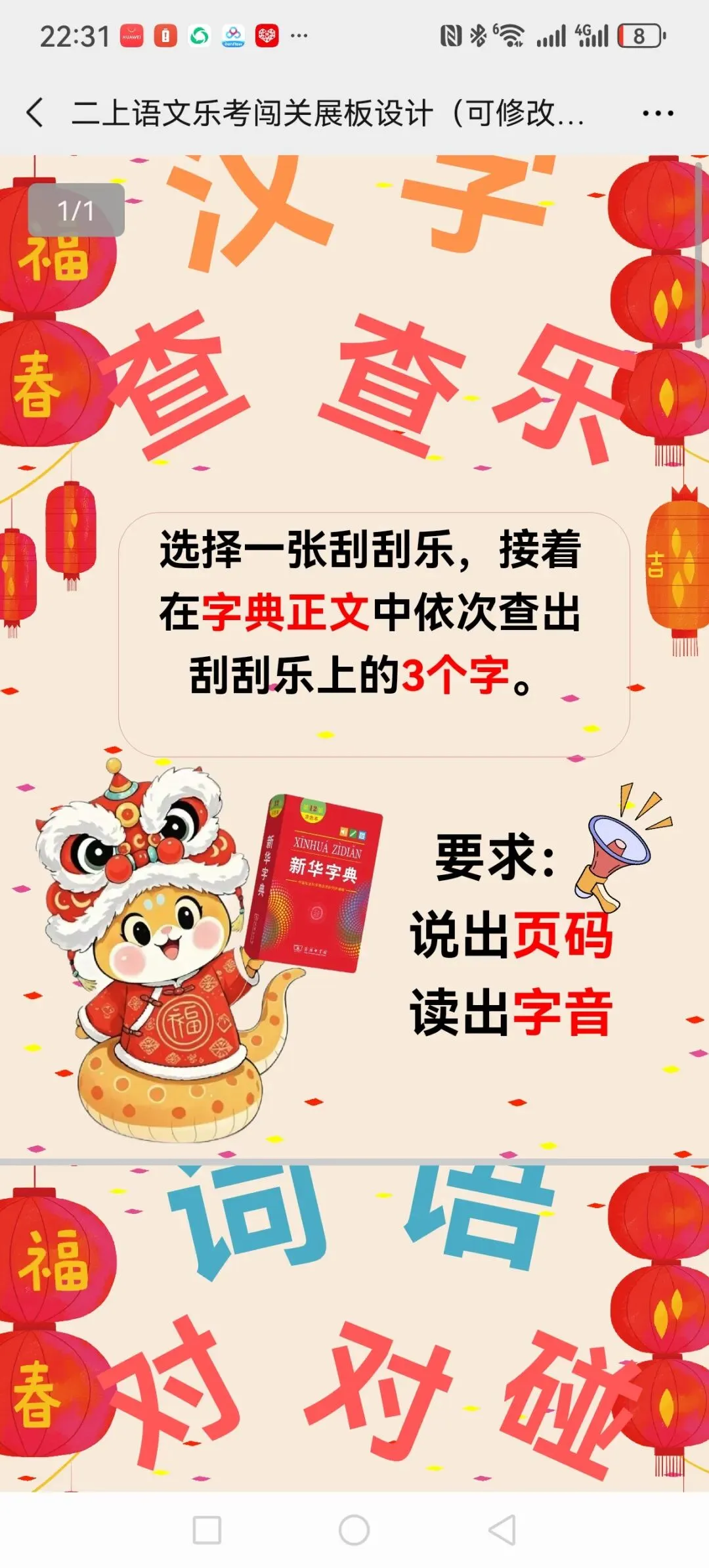 - 汉字查查乐:准备新华字典(每人一本)、刮刮乐卡片(印有二年级上册易错生字,每张3个)、刮奖工具、评分表。
