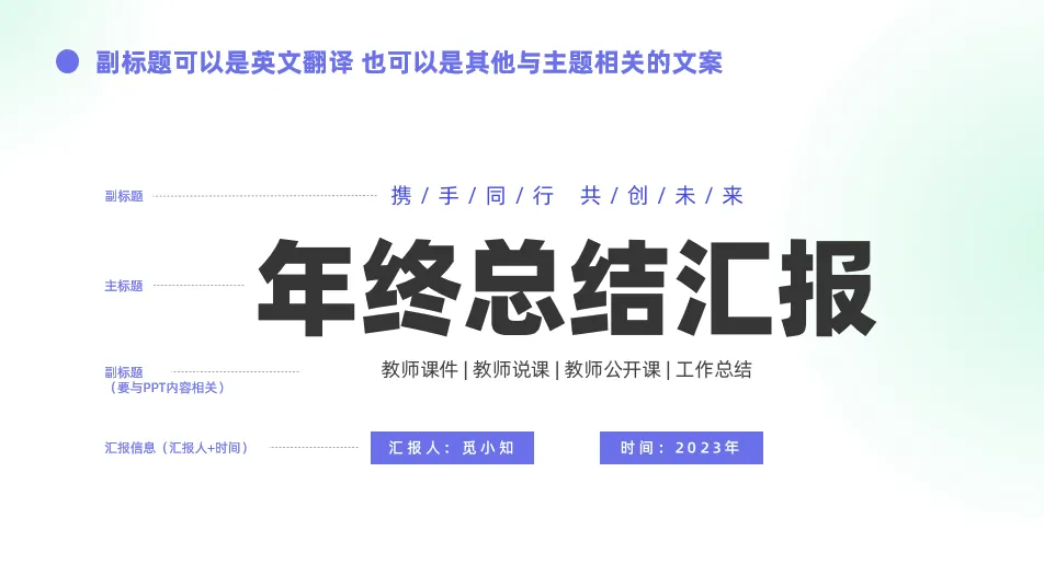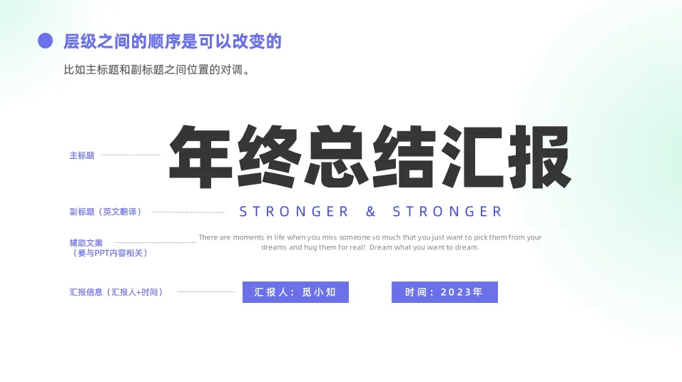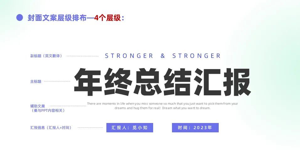 ④汇报信息(汇报人、汇报时间等)是封面中比较重要的层级,一般放在最后,字号12 - 16