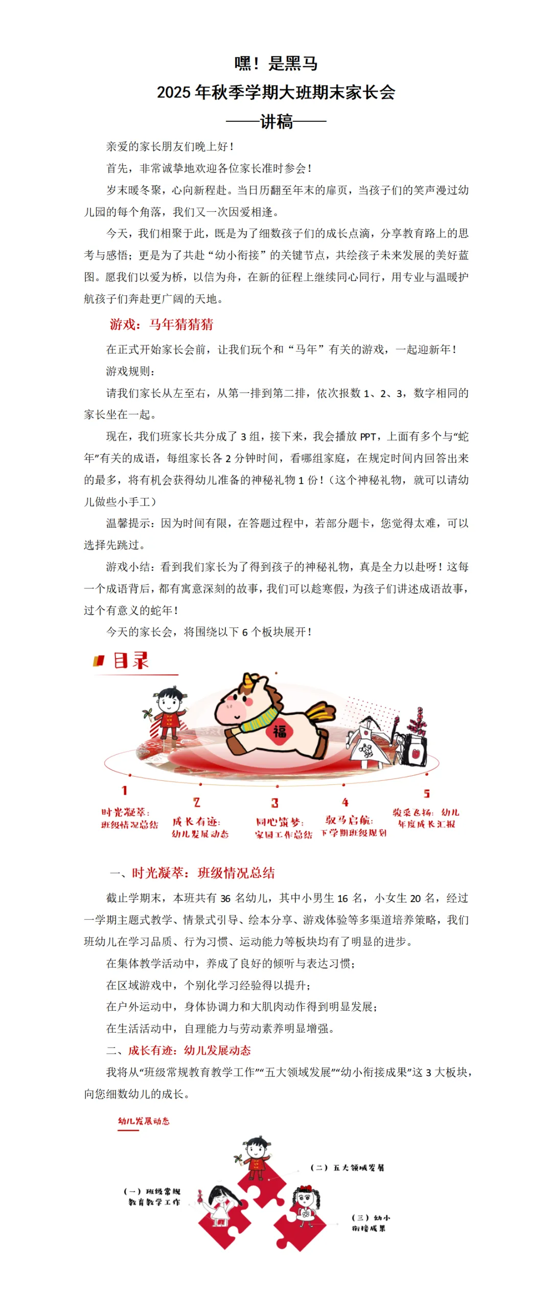大班上学期期末家长会(嘿.是黑马)PPT+发言稿