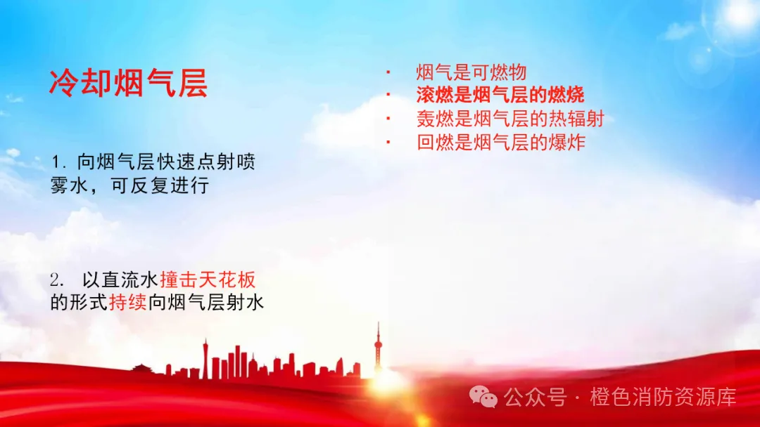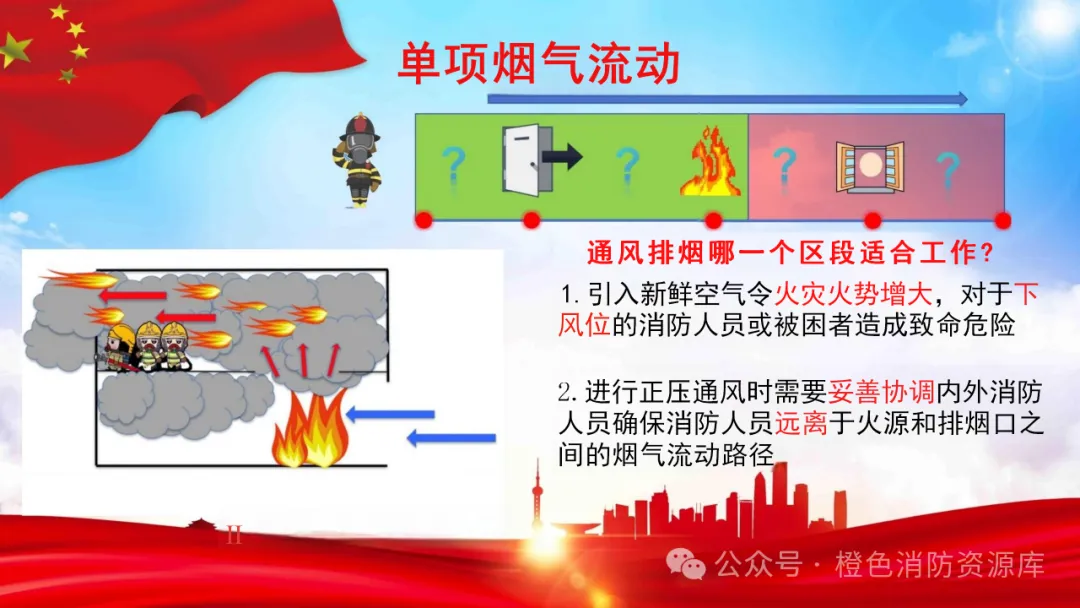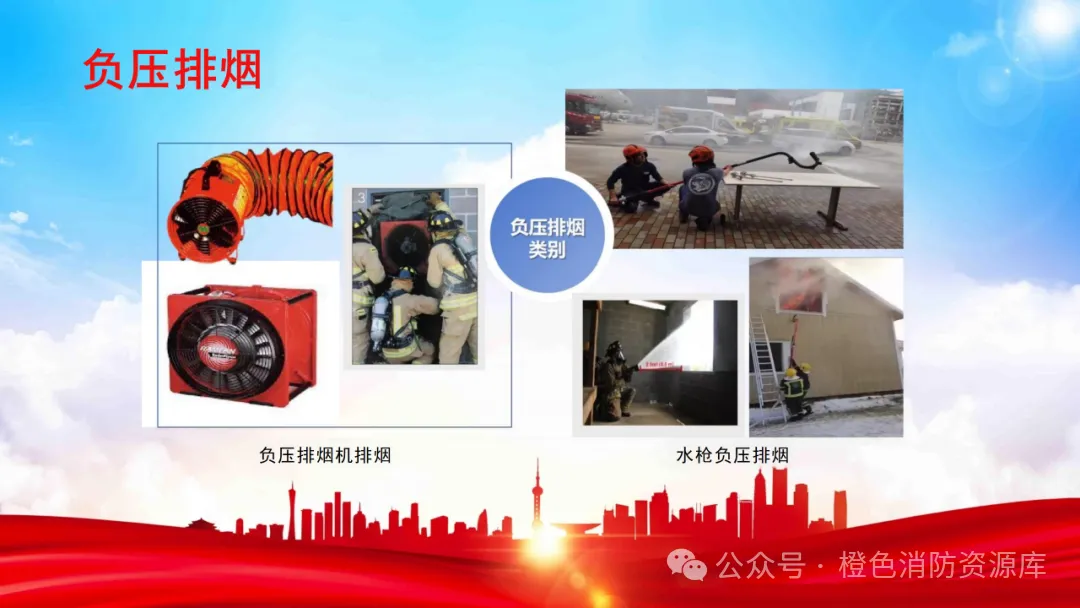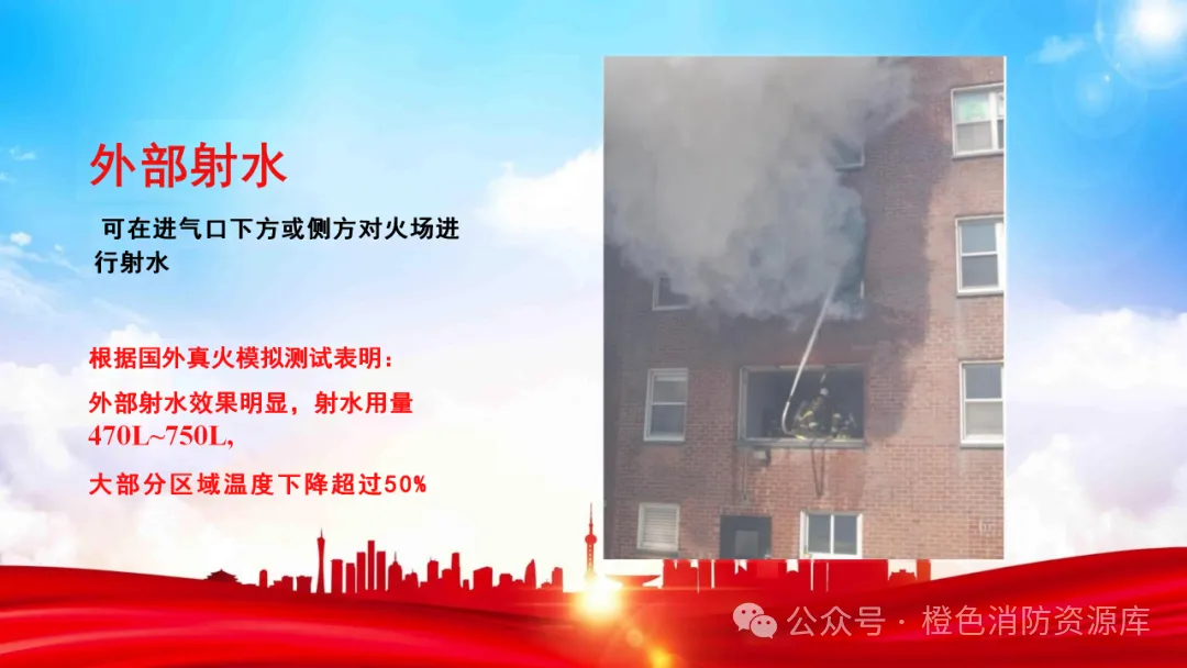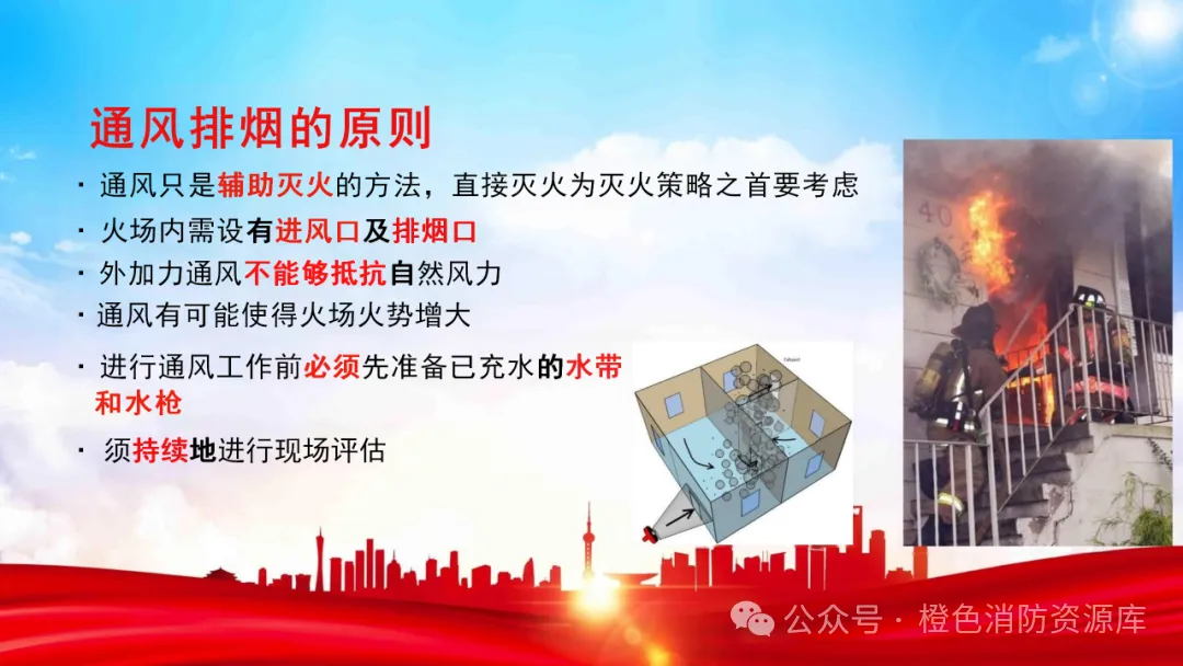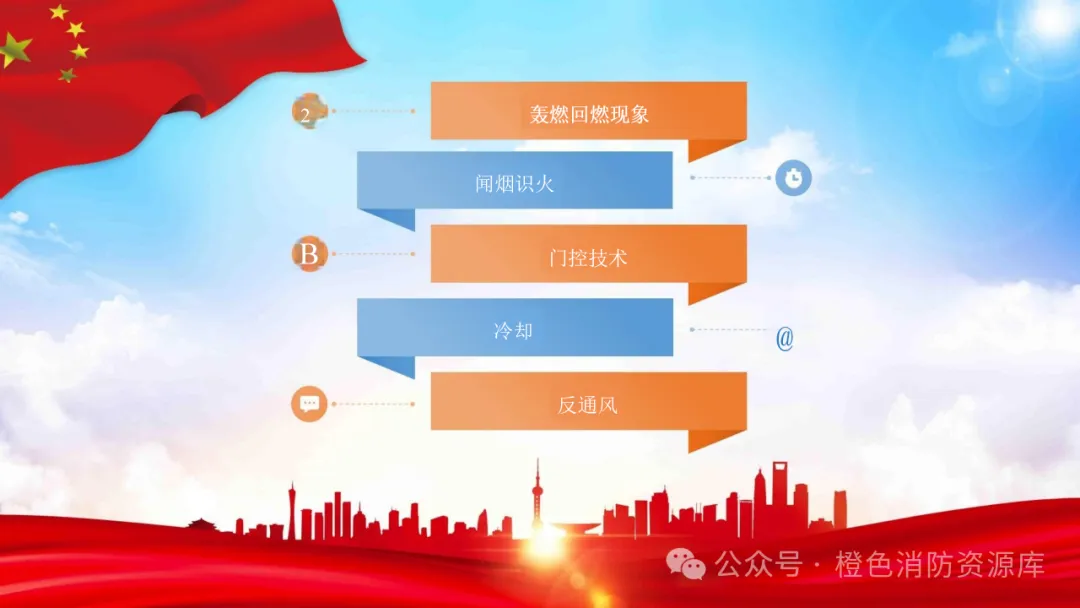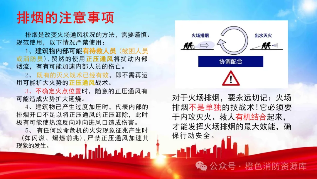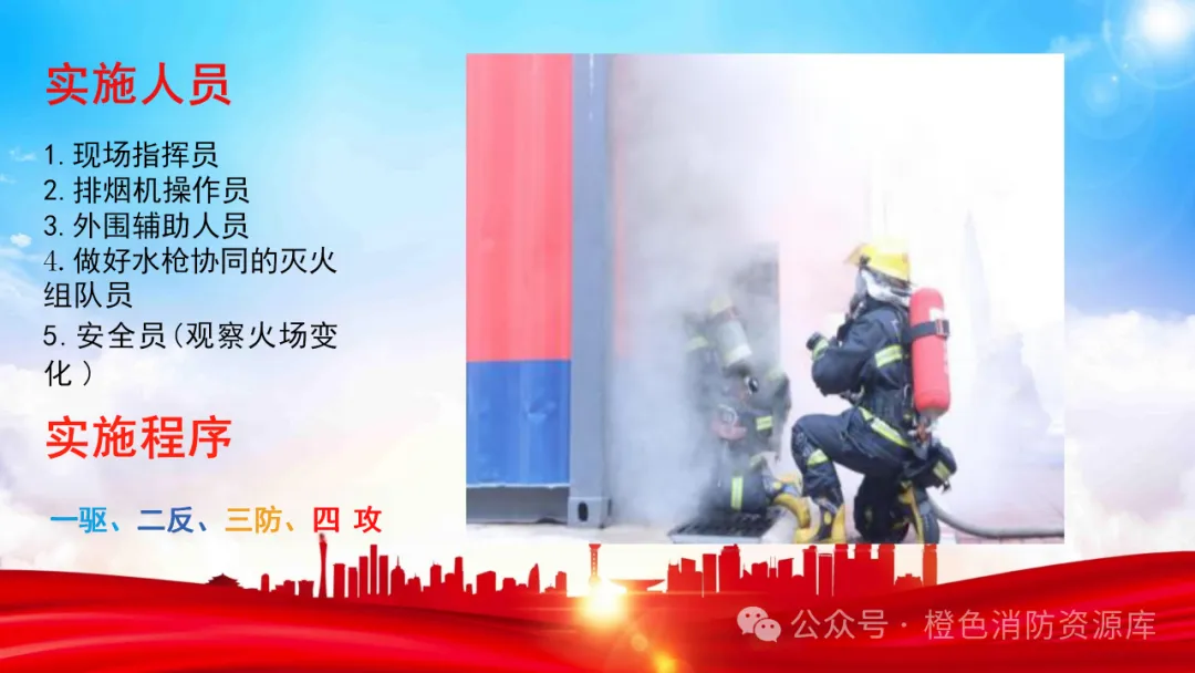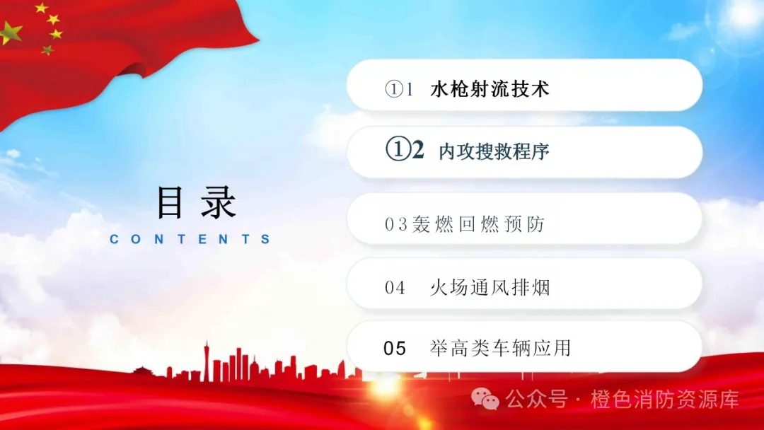 主旨内容:该课件围绕灭火救援基础技术展开,涵盖五大核心内容:水枪射流技术,包括跪姿、立姿等射水姿势及直流、喷雾、开花等射流方式,强调不同射流空气带入量差异及应用场景;内攻搜救程序,涉及火场信息收集、任务编组(内攻组与应急组轮换)、攻守判断、撤离时间估算等流程及实战问题应对;轰燃回燃预防,解析轰燃(600℃烟温、烟层下降)与回燃(烟气爆炸)特征,提出闻烟识火、门控技术、烟气冷却、反通风等预防措施;火场通风排烟,阐述烟气流动规律,介绍自然、机械等排烟方法及“辅助灭火、需进排风口”等原则与禁忌;举高类车辆应用,说明登高平台消防车(动力支持、供水、救人)和云梯消防车(伸缩云梯、滑斗)功能及操作规范。旨在系统提升灭火救援技术与安全效能。