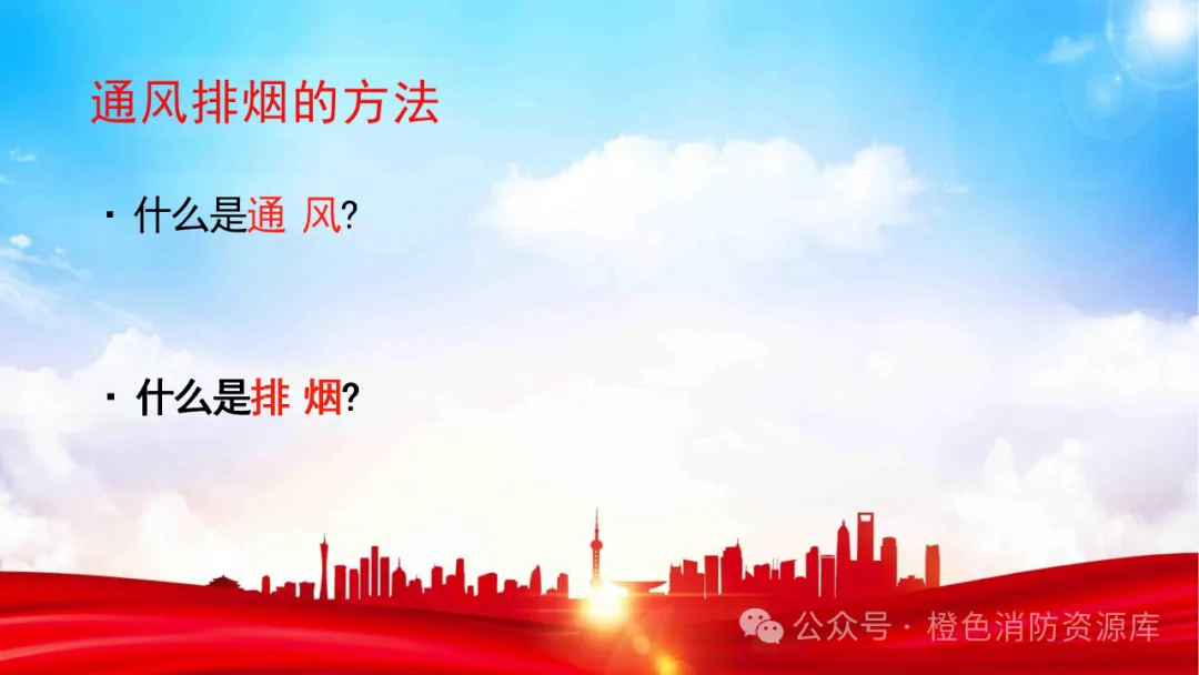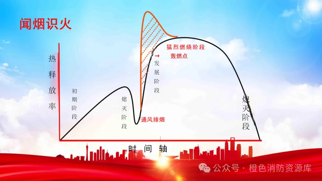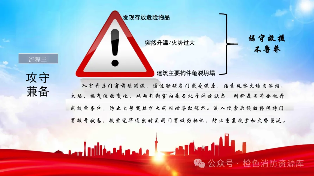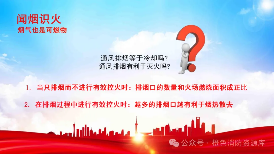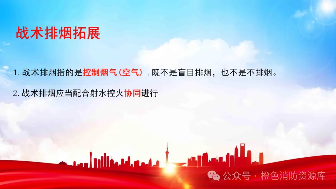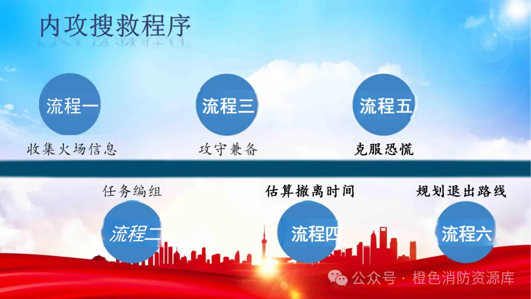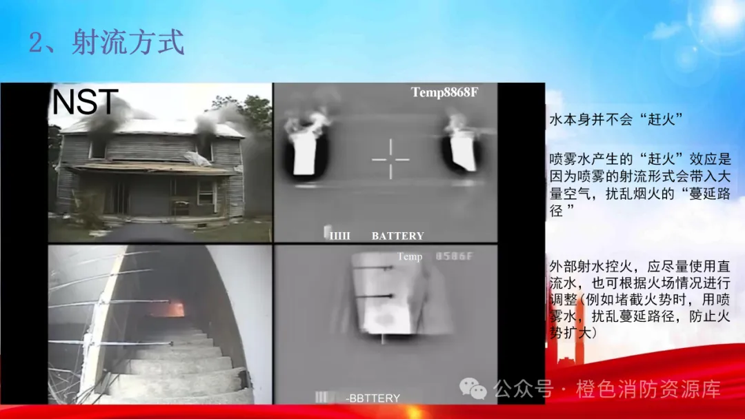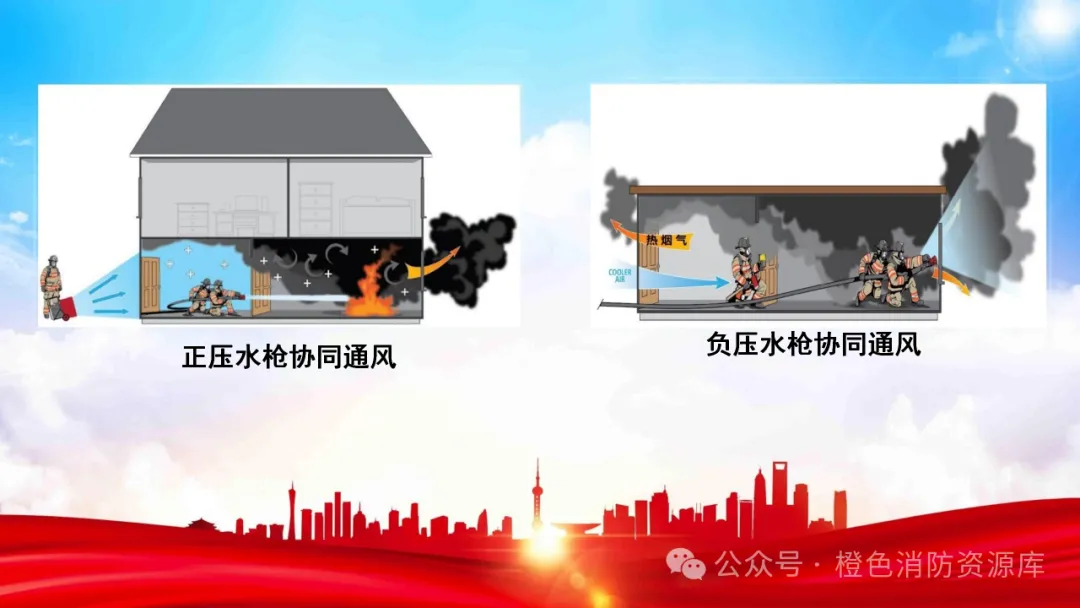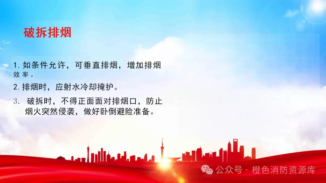 主旨内容:该课件围绕灭火救援基础技术展开,涵盖五大核心内容:水枪射流技术,包括跪姿、立姿等射水姿势及直流、喷雾、开花等射流方式,强调不同射流空气带入量差异及应用场景;内攻搜救程序,涉及火场信息收集、任务编组(内攻组与应急组轮换)、攻守判断、撤离时间估算等流程及实战问题应对;轰燃回燃预防,解析轰燃(600℃烟温、烟层下降)与回燃(烟气爆炸)特征,提出闻烟识火、门控技术、烟气冷却、反通风等预防措施;火场通风排烟,阐述烟气流动规律,介绍自然、机械等排烟方法及“辅助灭火、需进排风口”等原则与禁忌;举高类车辆应用,说明登高平台消防车(动力支持、供水、救人)和云梯消防车(伸缩云梯、滑斗)功能及操作规范。旨在系统提升灭火救援技术与安全效能。