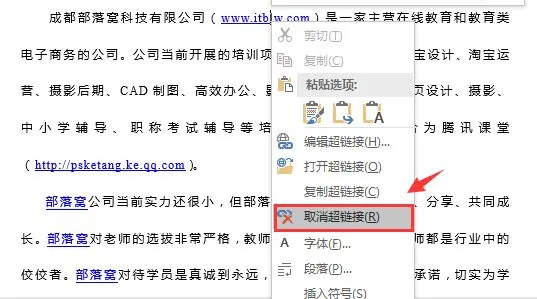 当文档中超级链接数量少的情况下,我们可以点击鼠标右键 - 选择【取消超链接】即可取消。