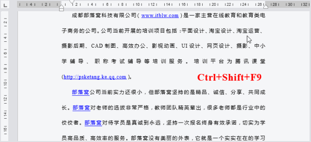 提示:由于超链接在Word中实为域代码,通过【Ctrl+Shift+F9】快捷键将文档中的所有域结果转换为普通文本,从而取消超链接。