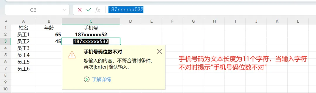 设置操作与限制数字基本一致,只是在第一步设置范围的时候,选择文本长度,第二步出错警告信息输入"手机号位数不对",操作如下: