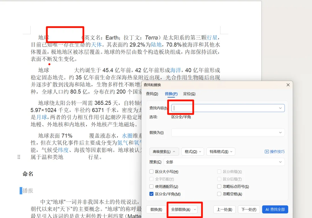 2、在查找内容这里,按一下空格键,表示空格,替换为的内容不填,表示删除查找的空格,然后点击全部替换,就能批量删除word文档中的空格。