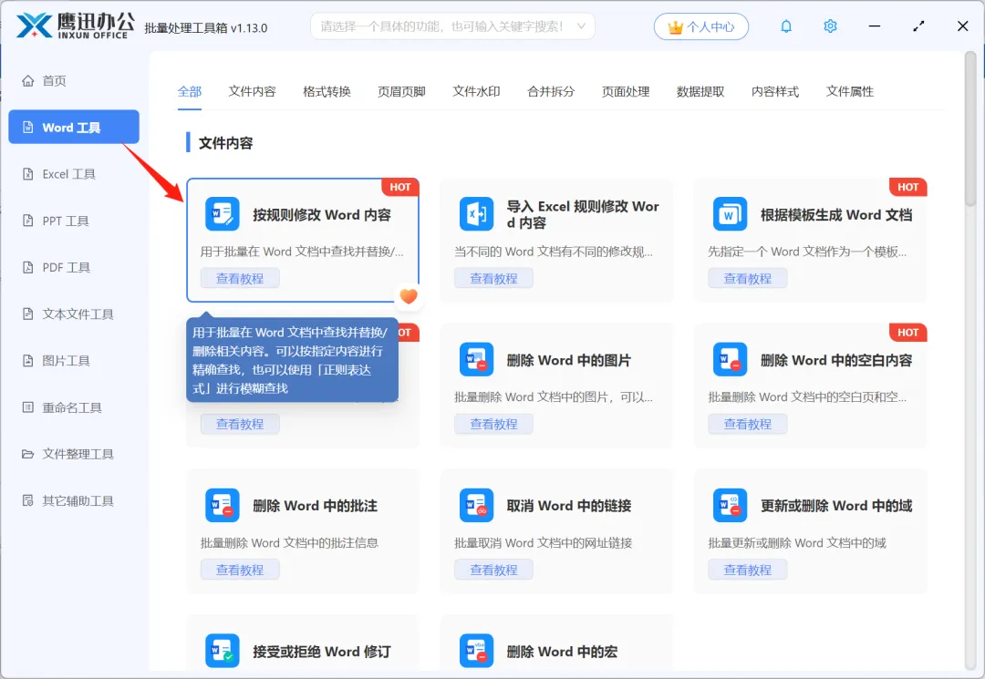 1、打开「鹰迅批量处理工具箱」,在「Word工具」选择「按规则修改 Word 内容」功能。