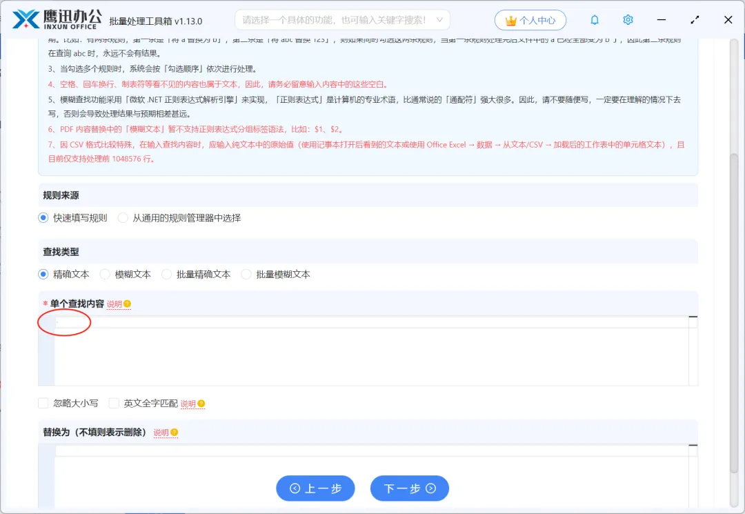 在这里,我们像方法一中的操作一样,查找前的单个公式就按一下空格键,表示查找空格,替换为的内容不填,表示删除查找的空格。这样我们就可以将上传的所有word文档中的空格全部删除了。然后点击下一步。