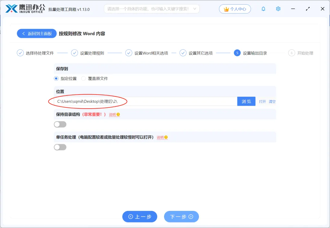 4、设置处理后的文档保存路径。