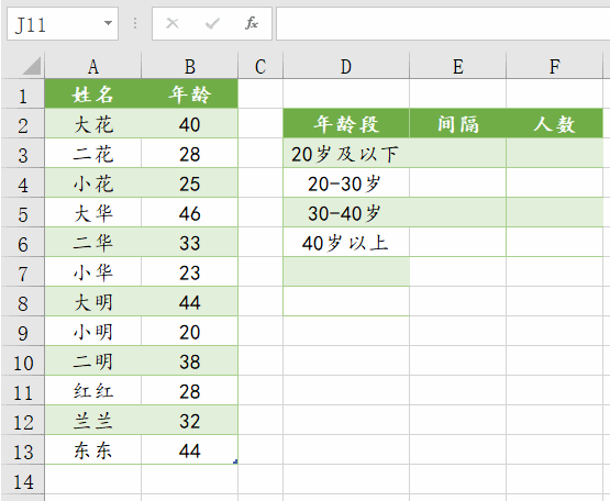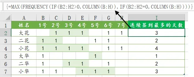 小伙伴们好啊,今天咱们分享FREQUENCY函数的典型用法。这个函数用于计算数值在指定区间内的出现频数,然后返回一个垂直数组。FREQUENCY函数将第一参数中的数值以第二参数指定的间隔进行分组,计算数值在各个区间内出现的频数。最终返回的数组中的元素会比间隔值的元素多一个,多出来的这个表示最高区间之上的数值个数。如下图所示,要根据D列的条件,统计各个年龄段的人数。然后同时选中F3:F6,编辑栏中输入以下公式,按<Ctrl+Shift+Enter>组合键结束编辑。注意,由于FREQUENCY函数返回的是数组结果,因此在直接使用该函数时需要按<Ctrl+Shift+Enter>组合键结束编辑才能正常运算。第二参数设置了3个间隔,结果返回了4个数字,最后这个数字,就是比最高的间隔值还要大一些的有多少。I2单元格输入以下公式,按<Ctrl+Shift+Enter>组合键结束编辑。=MAX(FREQUENCY(IF(B2:H2>0,COLUMN(B:H)),IF(B2:H2=0,COLUMN(B:H))))如果B2:H2大于0,就返回对应的列号,否则返回逻辑值FALSE,结果是这样的:如果B2:H2等于0,就返回对应的列号,否则返回逻辑值FALSE,结果是这样的:{2,FALSE,FALSE,FALSE,6,FALSE,FALSE}FREQUENCY函数能够忽略数组中的逻辑值,以未签到对应的列号{2;6}为指定间隔值,统计签到对应的列号{3;4;5;7;8}在各个分段中的数量,相当于分别统计在两个未签到列号之间有多少个签到的列号,返回内存数组结果为:也就是小于等于2的有0个,小于等于6的有3个,大于6的有2个。如果你觉得这个公式计算过程不容易理解,可以先记住按条件统计频率的模式化用法:FREQUENCY(IF(符合条件,相应列号),IF(不符合统计,相应列号))FREQUENCY函数还有一个特点,如果指定间隔中的数值有重复,会仅统计第一次出现时的间隔,后面重复出现的间隔值,计算结果会显示为0。并且第二参数不要求排序处理,函数会自动将各个间隔值按从小到大排序后计算对应的间隔数量,再将结果按原有顺序分配到各个单元格。利用这个特点,能够计算不重复的第n个最大(最小)值。如下图所示,B列的考核有很多个重复分数,希望从中提取出不重复的第3个最高分。=LARGE(IF(FREQUENCY(B2:B10,B2:B10),B2:B10),3)本例公式中,FREQUENCY的第1参数和第2参数相同,表示分别按B2:B10中的各个数值来对这个区域的数值进行分组统计,结果为:也就是99及以上的有4个,97~99以下的有1个,95~97以下的有1个,85~95以下的有1个……然后使用IF函数进行判断,如果FREQUENCY的计算结果大于0,就返回B2:B10单元格区域中对应的数值,否则返回逻辑值FALSE。得到内存数组结果为:{99;FALSE;FALSE;FALSE;97;95;65;85;70;FALSE}最后使用LARGE函数,忽略逻辑值从内存数组中提取出第三个最大值。更多函数公式神技,尽在《Excel函数与公式应用大全》