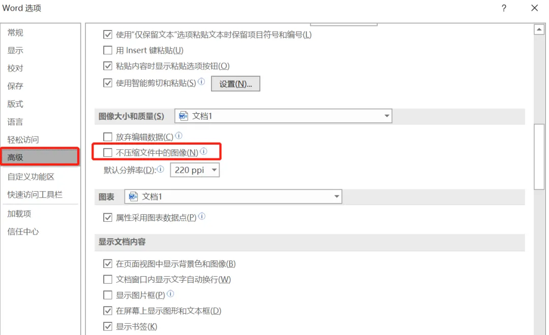 PS:之所以会出现变小的情况,是因为在插入图片时,系统已经默认压缩图像,当然若不想压缩,可以点击文件——高级——勾选【不压缩文件中的图像】的选项即可。