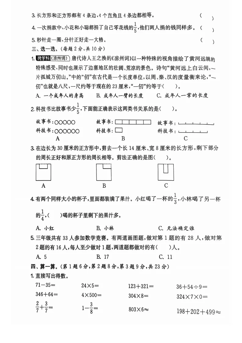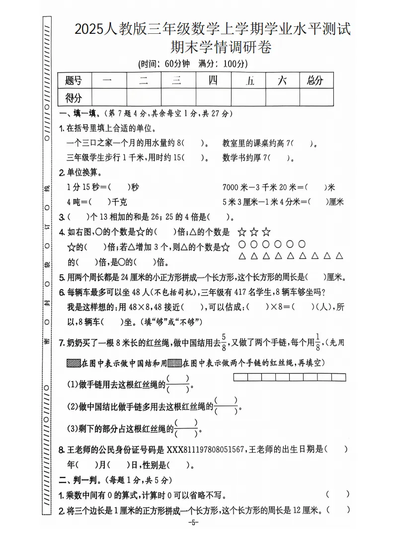 这份试卷是 2025 人教版三年级数学上学期期末学情调研卷,时长 60 分钟,满分 100 分。题型涵盖填空、判断、选择、计算、动手操作和解决问题,全面考查基础知识点与应用能力。填空、判断、选择题聚焦单位换算、图形周长、分数应用等基础内容;计算部分包含直接写得数、竖式计算和脱式计算,注重运算能力;动手操作与解决问题则侧重实践应用和逻辑思维,贴合三年级学生的学习重点,能有效检测学业水平。2025 人教版三年级数学上学期学业水平测试期末学情调研卷详细答案